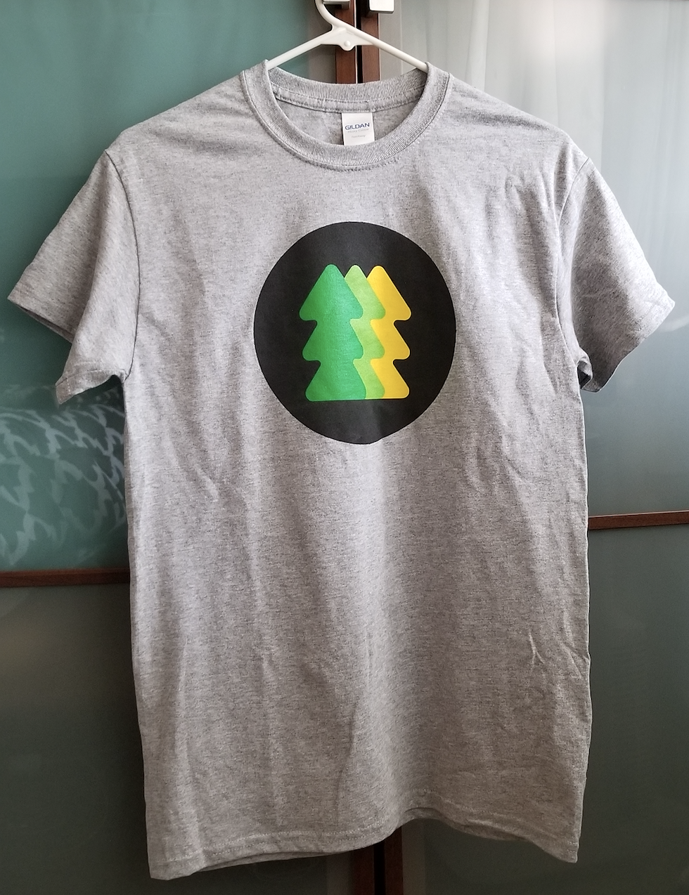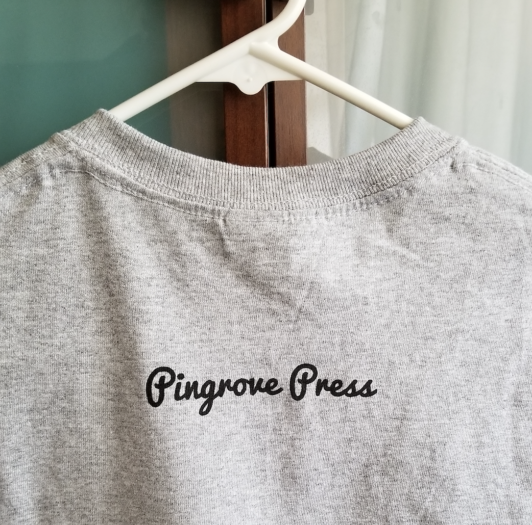 The very first Pingrove Press shirt. Printed on unisex, heather grey, Gildan Heavy Cotton t-shirts.
