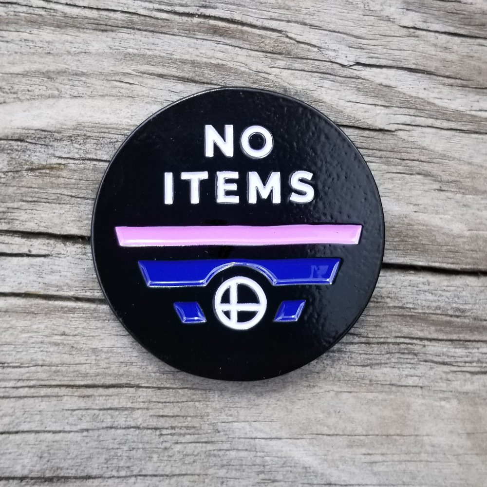 40mm, soft enamel pin, single rubber-clutch backing. Pins are individually packaged with a custom backing card and a cellophane bag.