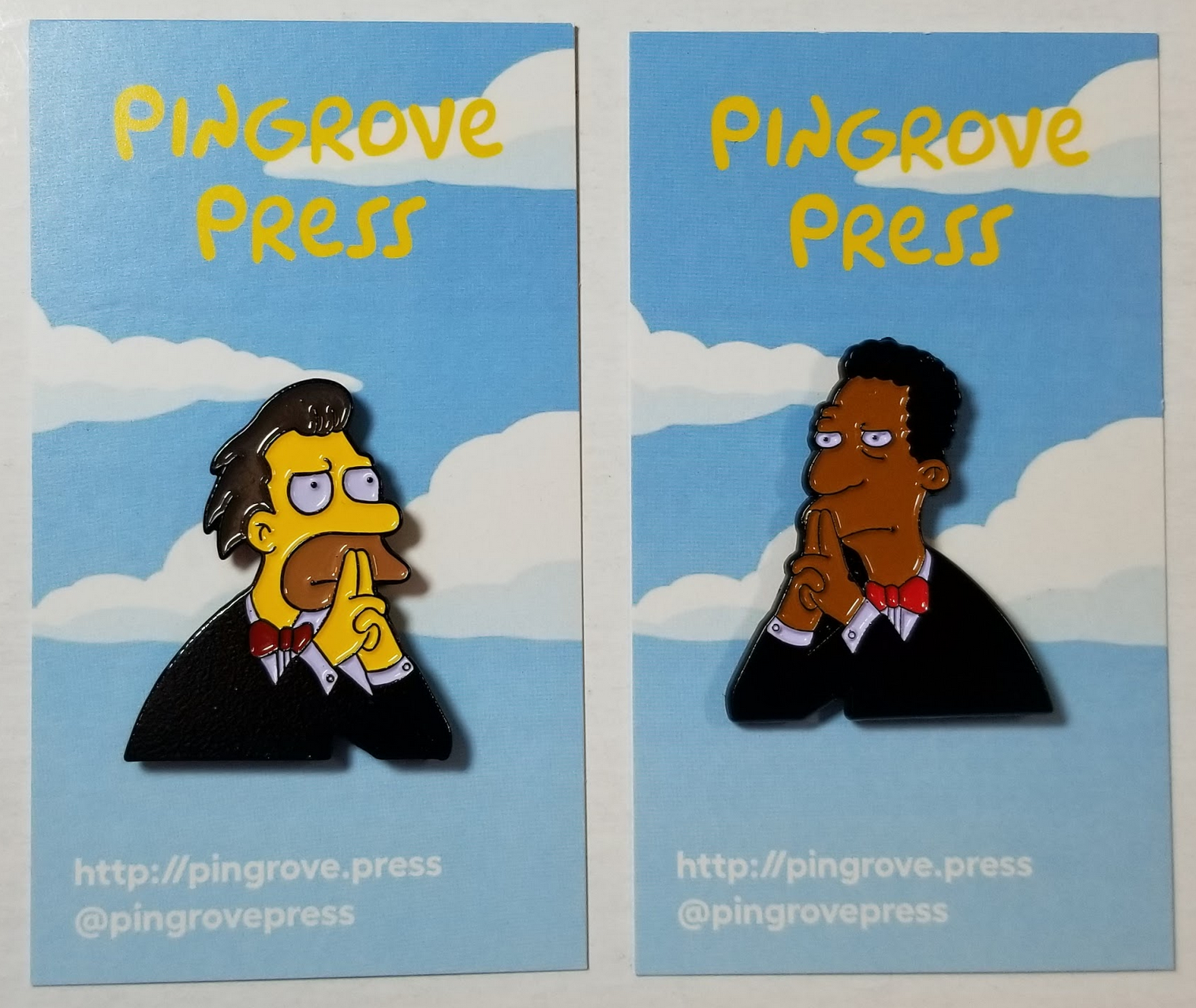 Each pin is 35mm, soft enamel, with two rubber-clutch backings. Pins are individually packaged with a custom backing card and a cellophane bag.